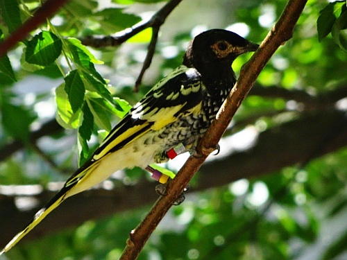 Above image: a male Regent Honeyeater that was originally released with White Mauve Red Metal (WURM) leg bands in April 2015 (see 2015 release information).