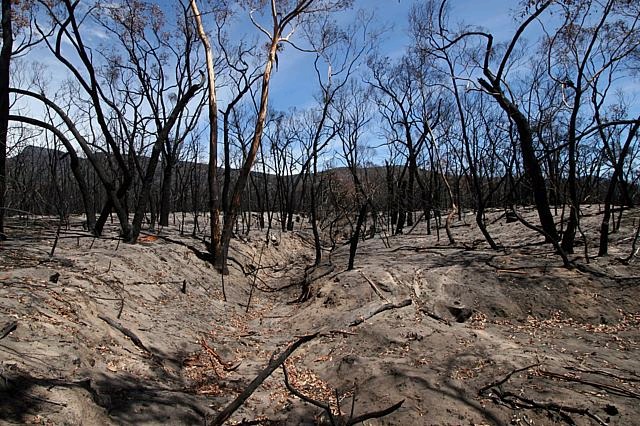 Typical scene of Long-nosed Potoroo habitat loss (wet heath and adjoining riparian habitats along drainage lines that are associated with higher soil moisture and vegetation density) after high intensity fire in Grampians.