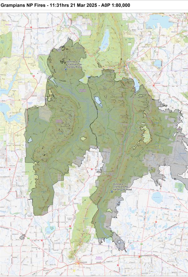 In late December 2024 to March 2025 a major bushfire burnt almost the entire Grampians N.P., including areas once known to be Long-nosed Potoroo habitat.Shaded area indicates extent of 2025 fires. Source: Business Victoria. pdf version.