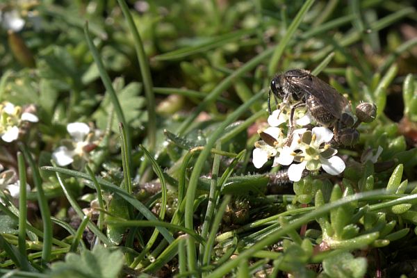 Pollination of Southern Shepherd’s Purse flower in ex-situ seed tray by a native bee. Hoverflies and butterflies also visit the flowers, but it is uncertain if they are effective pollinators. Wasps may also be a pollinator of this species but the primary pollinator in the wild has not yet been determined. Image: Stan Wawrzyczek.