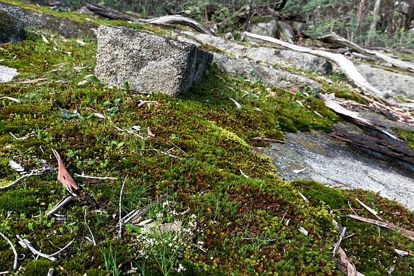 Typical habitat at Mount Alexander/Leanganook, granite rock outcrop at higher elevation with abundant moss mat. Image: Stan Wawrzyczek.