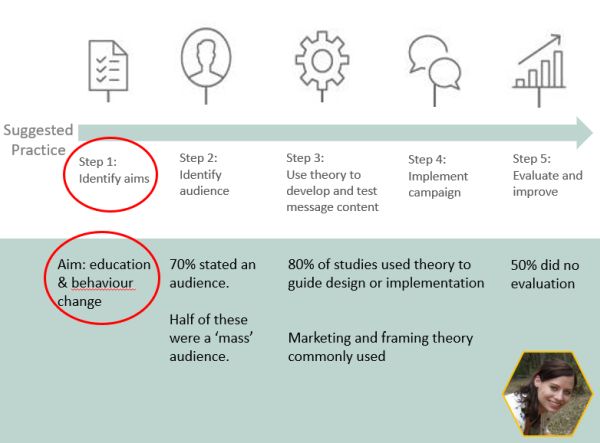 Indications are that many of the aims of these studies were a bit vague – to educate, to create behavior change. Also, whilst 70% of studies stated an audience half of these were a mass audience – not really being very specific, not allowing for any real strategy when it comes to the communication.